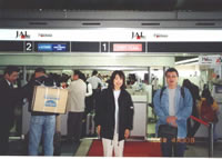 直接空港に来る亀谷さんとの待ち合わせ場所であるJALカウンター前にて待つ。 そこで私たちの目を釘付けにする人物が現れた。ビジネスクラスのチェックイン・カ ウンターで手続きを行っている彼は、カップラーメンの入った段ボール箱に紐をかけ て背負子のようにしている。係員の人もその背負子に興味を示している。日本からの お土産にカップラーメンは喜ばれるらしい。なるほど、周囲を見ればカップラーメン の段ボール箱を持った人がそこここにいるではないか。ところで、ファーストクラス、 ビジネスクラスのカウンター前には、それぞれ赤、青のマットが敷かれている。エコ ノミークラスの私たちは踏むことのできないマットの上に乗るふりをして、さりげな くカップラーメンの彼の横に並んで記念撮影をした。