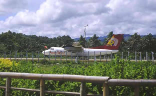 待合室で待つこと1時間。飛行機が到着し、チケットを手に並ぶ。ふと見れば、新 婚旅行らしき韓国人のカップル。夫がチケットを紛失したらしく、あたふたしている。 妻は夫の鞄の中をゴソゴソ探しながら問い詰めている。しばらくして、ようやく見つ かり、事なきを得た彼らは最後尾に並んだ。そして、チケットを渡す係員に呑気に写 真を撮ってもらっている。すると今度はチケットを風に飛ばされて拾いに走っている。 全く緊張感の無い夫婦である。私たちは、タラップの上に立って振り返り、満面の笑 みを浮かべて彼らの記念写真に写ってやった。