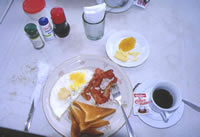 本日は、7:45に集合のため、6:00に朝食をとる。昨年同様、注文してから食事が 出てくるまでの時間が長い。しかし、ここはボラカイ。時間の流れを忘れて、優雅に リゾートライフを楽しむ人々は、それくらいのことでイライラしてはいけないのだ。 ブレック・ファーストのメニューはとてもシンプルで、コーヒーとパン、目玉焼き、 炒めたベーコン、そしてデザートである。昨年に比べ、デザートがプラスされていた ことに感動した。新鮮なマンゴーはとてもおいしかった。
