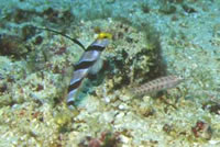 EN後まずは、みんなで水中記念撮影。そして、水深29mにいるホタテツノハ ゼを見に行く。途中、砂地には水深20mにチンアナゴ、水深22mにアキアナ ゴ、水深26mにニシキアナゴが見られた。目的地に着きホタテツノハゼがペア で出迎えてくれた。しかし、恥かしがり屋なのか穴に直ぐに引っ込んでしまった。 待ちたかったが水深が水深だけに(しかも1本目はヤパックだったし)長居がで きない。残念だが、後ろ髪を引かれる思いでこの場所を後にする。次に水深26 m辺りでメタリックシュリンゴビーとご対面。遂に減圧停止指令がくっきり出て しまった。水深を上げ、シンデレラウミウシを通過し、ヒレナガネジリンボウを 見る。この子は慣れているのか近づいても逃げない。他にもヤノダテハゼ,ハナ ヒゲウツボが居るらしいが今回は見に行かなかった。