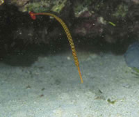 とても穏やかな海をクロコダイルに向かいボートは進む。 ポイント到着後ENし緩やかなな流れに漂いながら砂地に移動し、アキアナゴを見る。 彼らは体を懸命に延ばし流れてくる餌をほおばっていた。アキアナゴをあとにして砂地とサンゴ礁 の境を移動する。サンゴ礁にはチョウチョウウオ各種が泳ぎ回り、ホホスジタルミ・ タテキン・アザミカワハギ・カンムリニセスズメダイ等各種スズメダイ・シンデレ ラウミウシ等ウミウシ各種などに遭遇。そして、昨年白いオオモンイザリウオに会 った洞窟に到着。今回はオオモンの子供(体長:約50mm)が居た。洞窟には、 キンメモドキの群れ。オオモンを見たのち、来たルートを戻る。