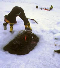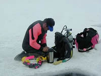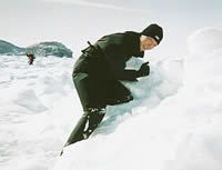 前の日に開けたエントリ用の穴には氷が張っている。 その上でみんなで飛び跳ねて氷を割るという単純な遊びなのだが、 ドライスーツを着ているとはいえスリル満点。 ついつい昂奮して氷が割れる頃には体が暖まっているという寸法。