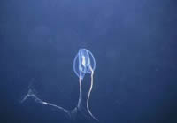 昨日のブリーフィングの通りクリオネには会えなかったが、 ライトの光を当てると七色に光るウリクラゲや 三つ編みの女の子の頭の後ろ姿になんとなく似ているフウセンクラゲが プカプカと気持ち良さそうに浮いている。 フウセンクラゲは触手(これが三つ編みのお下げね。)に触れると くるくると縮んで面白い。 そして、羽の生えたカタツムリの殻のようなミジンウキマイマイ。 大きいので貝の巻いた様子や羽の形が良く見える。 けなげにパタパタとはばたいているところをチョンとつつくと 「ビクッ」てな感じで動きが止まるが、暫くするとまたパタパタ。 神様ってぇのは面白い生き物を創るもんだと、つくづく感心する。 潜水時間20分、水温-2度。最大水深6.9m。