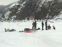 機材を片づけてソリに積み、バスの近くまで戻ってドライスーツを脱ぐ。 するとなんと、スーツの内側で結露した汗がインナーの表面で 見る見る凍っていくではありませんか。なんという極限体験。 これはふるはたさんも初めての経験だったようで、 一同「寒!!」を連発しつつヘラヘラと笑う。 井手さんはこの寒さでダイビングブーツが破れ、中圧ホースにひびが入ったそうだ。