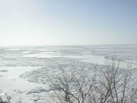 気温は昨日よりずっと暖かく、-2度。 焼き鳥をほおばり(今日はカキは無し)紅茶を飲んでいると 少しづつ青空が見え始める。 沖の方に目をやると、昨日はまっ平らだった氷が心なしか凸凹している。 北風に煽られて氷が押し寄せ、盛り上がってきたのだそうだ。 盤石に見えた氷が一晩で様相をがらりと変える。不思議は尽きない。