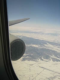 10:30離陸。日本海を跳び津軽海峡を抜けるコース。 富士山の見えない側の席だと判った途端に眠気が襲う。 一寝入りして目が覚めると眼下には黒い海と白い大地。釧路上空である。 10分程で機体は降下を始め、12:20女満別に到着。 到着ロビーを出て網走駅行きのバスに乗り込む。 一応「空港バス」だが車内の通路や網棚は狭く、荷物の置き場を確保するのに一苦労。 機材を送っておいてほんとに良かった。