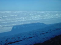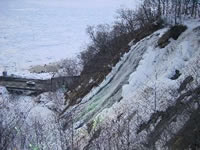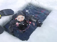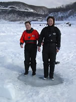 本日のポイントは車で3分の幌別キャンプ場前である。 ポイントに着くとドライスーツに着替え、斜面を下り流氷へ降り立 つ。流氷の上を沖に向かって200m程歩くのであった。