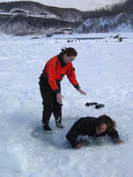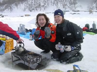 インターバルには恒例の焼き鳥&苔桃ジャム入り紅茶を食し、腹ごなし&寒さ対策に マサイ族遊びや氷上の池で戯れるのであった。とってもスリリングである。