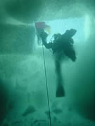 早いものでもう最後のダイビング。各自思う存分潜るのであった。前半、中層でクリオネ・ マイマイを追いかけ、中盤は海底を這いギンポ を追いかけ。後半は淡水層の中氷の真下を移動 し様々な形の氷を見て回る。心置きなく堪能しEXするのであった。