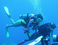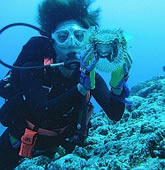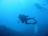 いよいよダイビング開始。今日は3ダイブです。まずはトンバラザシ。天気晴れ、海は鏡のような穏やかさ、こんなの初めてです。気温33度水温31度、透明度は20mぐ らいかな。ダイブタイム53分最大水深、私の記録で20・2m、見た魚、クレナイニセスズメダイ・モンツキカエルウオ・リュウグウウミウシ・セジロノドクロべラ・スミツキべラ・カメ・その他いろいろ。