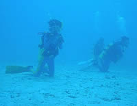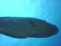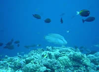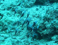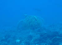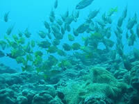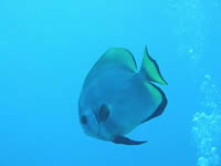 ポイントにつくと、既に数隻のボートがエントリ中。ブリーフィングをしつつ順番を待つ。 エントリするとジャーマンにしては透視度が良い。マンタ待ちの根に向かって流していくと、 カンムリブダイが現れた。砂地にはいつものようにガーデンイールやヤセアマダイ、ダンダラダテハゼ、ヤマブキハゼなど。マンタを待ちながらダテハゼと遊ぶ。10分、15分、・・・ マンタはどこかで道草を食っているらしい。ランデブーは諦めて点在する根に付く イシガキダイ、マダラタルミ、ホホスジタルミ、モヨウフグなどを見ながら浅場へと移動する。 安全停止のために中層に上がるとギンガメアジの群に遭遇。 カメラを持つメンバーがベストアングルを求めて群の周りをぐるぐる回る。