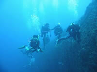 ひとしきり流して棚から離れ、安全停止時に100本の垂れ幕をバックに記念撮影 ・・・あらら?沈む沈む。軽いダウンカレントにつかまってしまった。 去年もこんなことがあったような・・・ 気を取り直して、はい、チーズ!!
