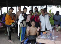 土砂降りの中、ペリリュー島に上陸してランチ。 港にはブランコ一家(一族?)がバーベキューを始めていた。 今日はブランコの息子さんの4歳の誕生日。僕たちもケーキやバーベキューを分けてもらう。 さっきの釣果のサバも刺身でいただく。ライムとしょうゆでさっぱり味。