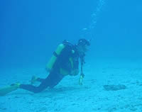 ブランコがタンクを鳴らして棚の奥を指差す・・・が、何も見えない。 ブランコの目が良すぎて我々にはかすんで見えないような遠くの物まで見つけて教えてくれるのだ。 またか、と思いつつ目を凝らす。と、突然岩が動いた。大きなアカウミガメだ!!びっくり。