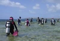 メンバーはAチーム平木さん、吉澤さん、磯谷さん、佐藤さん。Bチーム古旗さん、井手さん、足立さん、八島先生、 亀ちゃん、玉ちゃん、私に分かれて行動。エントリーは日本の海と違い、足場もよく広いのでとても楽である。 少し歩いた所で玉ちゃんのマスクのストラップが切れてびっくりするが、とりあえず潜れるようだ。 よかったと思うのもつかの間、私にもハプニングが起こるのである。