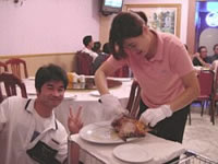 北京ダックを切り分けてもらう |
