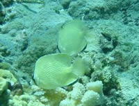 1本目終了しサービスに戻り昼食である。昼食後、サービス前の ビーチでシュノーケリングである。ミナミハコフグは見れなかったがタテジマキンチャクダイ の幼魚に遭遇。ちょろちょろ動いて写真が撮りずらかった。
