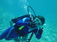 オブジャンビーチの隣のポイントに到着。初めてのポイントだ。 人がまだ入っていないせいか荒れていない。珊瑚が群生し綺麗である。 光が差し込み水中は明るい。どこまでも続く青い海!海底にはダイバーの影が映る。 1本目のダイビングを堪能するのであった。