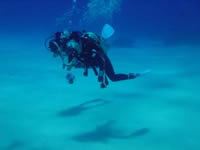 マダラトビエイが集まることで有名なポイントである。 流れのない海にEN。トビエイ待ちの根に着底し暫く待つが現れない。 もうひとつ他の根に移動したとき1匹登場。その後最初の根を 見るとトビエイが泳いでいるではないか。ゆっくり近づき間近に見れたよ。トビエイはダイバーを観察しているようだった。 今回は2枚だった。満足満足。最後は記念撮影をしてEXするのであった。