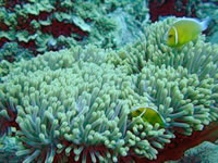 混雑していたので左の方からEN。珊瑚の上を漂いながら海底をに目を 向けるとハゼがこっちを見ている。オドリハゼやヤマブキハゼを観察し、パイプライン に到着。途中、ダスキーアネモネフィシュと戯れた後、ハナビラクマノミと戯れる。センジュ イソギンチャクのベットはハナビラクマノミにはとても気持よさそうである。 パイプラインに沿ってEXするのであった。