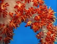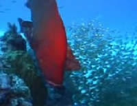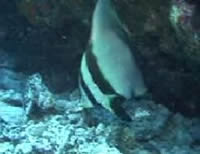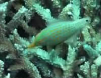 屋嘉比島北側、やや沖の露出岩を回るコース。流れがあれば大物も期待できるらしいが...、そうお気づきですね?全く流れてませんでした(とほ ほ)。エントリー後岩の下にはネムリブカ。別の露出岩にはプチケーブがあって、イソバナが生えてます。こうなるとやることはイソバナガニ探し。あきらめか けていた最後にいたよ〜ん、かわいいやつ。でもとっても撮りにくかった。ここのイソバナ全部上からぶら下がってるんだもん。ケーブ出口ではアカククリがお 出迎え。徐々に深度を上げ、棚の上でご休憩。なんとかべラが集団で産卵してました。サンゴの間にはカスリフサカサゴのペアも。そしてお約束、輪になって浮 上。潜水時間 42 分、最大水深 29m、水温 27℃、透視度 Good。
