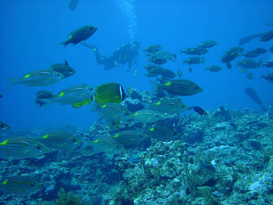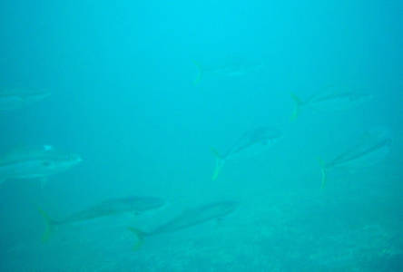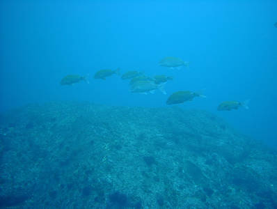 土曜は風もなく穏やかな海OWの講習だと言うのに湾内棚下に下りた瞬間、タカベの群れに取り囲まれ