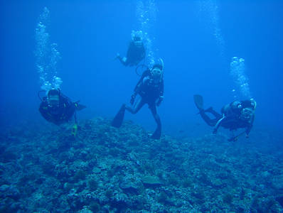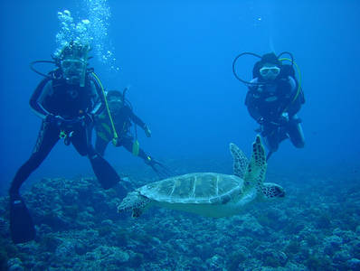 天候の割には、潜降してみると海の色はブルーいきなりウミガメ、