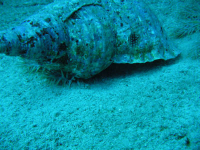 遭遇、頭は私と同じ位ビックリ、オニヒトデを食事中のほら貝(ビデオに収録)