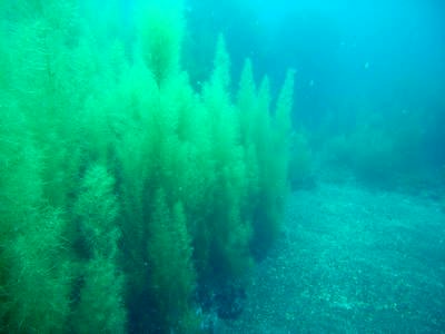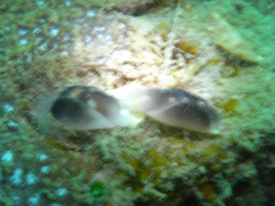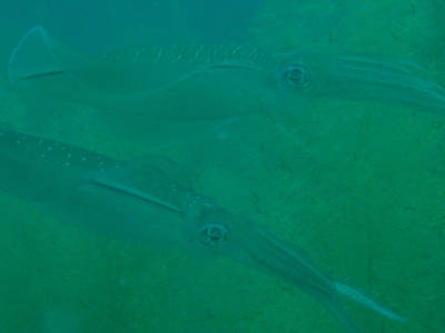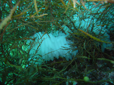 砂が舞い上がり透視度は落ちてますが、そんなに水質は悪くないですね、海藻の中にはアオリイカの卵も