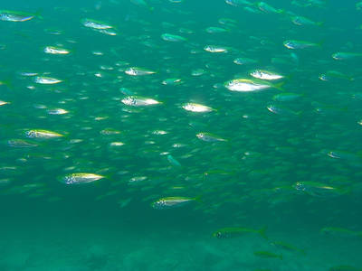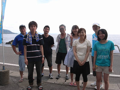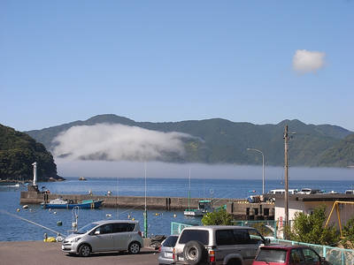 【海洋状況&後記】 海面温度と気温差で霧が発生対面の山は写真この後すっかり霧に覆われていましたが午後になり 時折こちらにも霧が流れて冷却効果で涼しい風がそよそよと吹きました。(地元の漁師さんに聞いたらこんなの見た覚えないと) そんな、珍しい眺めの中でのオープン講習でした。二日目には、アオリイカのハッチアウトしたての幼魚も観察できて ラッキー、無事に育ってください。