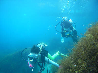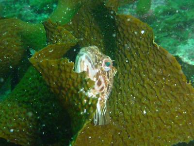 この透視度と透明感水温は30度水着でも暑い一日です。暑いせいかタツくんも海藻の影に・・・・・・(^^)/V