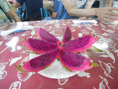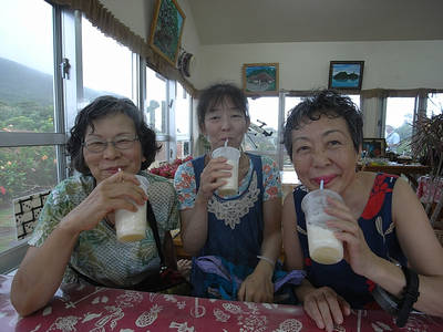 観光後記;観光ポイント比屋定バンダ(高台からの海の展望は風が強かったー、でも海は 荒れていてもきれいでした。)、宇江城跡(360度の大パノラマは島の良さが一望です。)、パイン園 あまーいパイナップルにしたづつみよーく冷えていて頭がきーん、ドラゴンフルーツはさっぱりとした甘さと なんともいえない舌触りが不思議な果物です。(パイナップル園には、入らないでね)あじまー館前の琉球ガラスのおみせに、 久米島のそばやさんでは(雨と風が強いのに)行列です。もやし味噌味そばは絶品です。(ラーメン通なら一度は食べてほしい)
